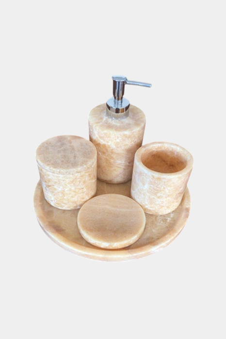 Doğal Onyx mermerin eşsiz damarlarıyla tasarlanmış bu banyo seti, hem şıklığı hem fonksiyonelliği bir arada sunar. Sabunluktan diş fırçalığına kadar her detay, banyonuza lüks ve sofistike bir dokunuş katar.